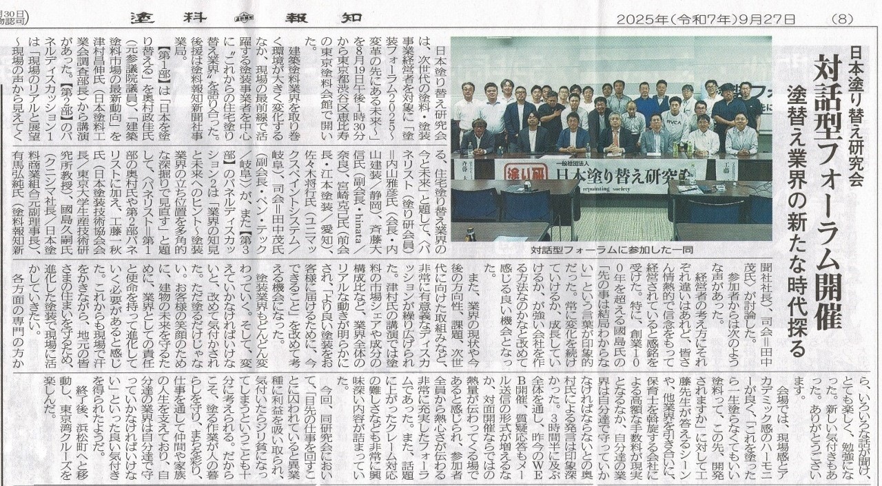 先日ご報告しました、弊社代表診断士・代表取締役 佐々木将行 がパネリストとして参加した 「塗装フォーラム」 の様子が、業界紙 『塗料報知』(2025年9月27日号) に掲載されました。