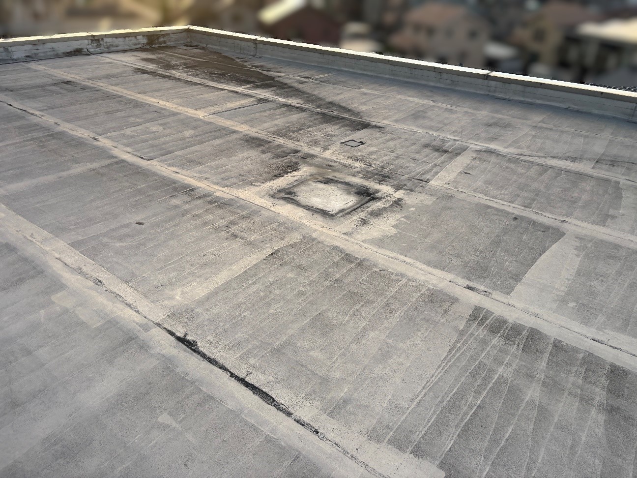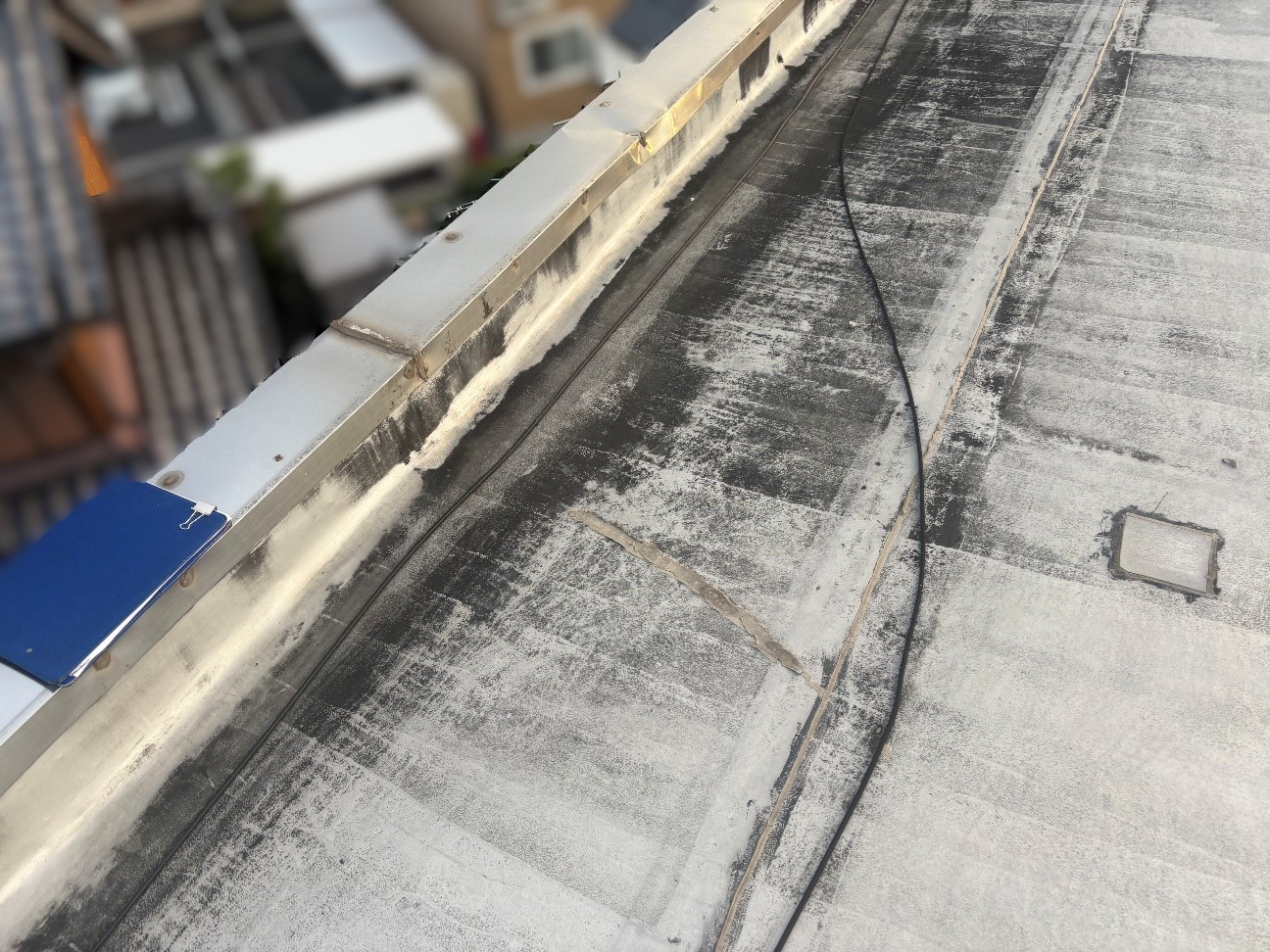 屋上の写真:防水層や笠木部分の劣化と過去の補修跡が見られます